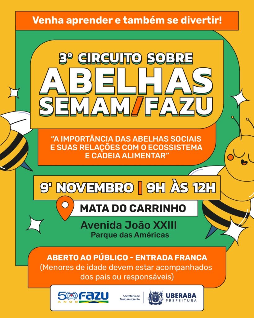 A Prefeitura de Uberaba, por meio da Secretaria de Meio Ambiente (Semam), em parceria com as Faculdades Associadas de Uberaba (Fazu), promove no próximo domingo, dia 9 de novembro, a terceira edição do Circuito sobre Abelhas, na Mata do Carrinho.