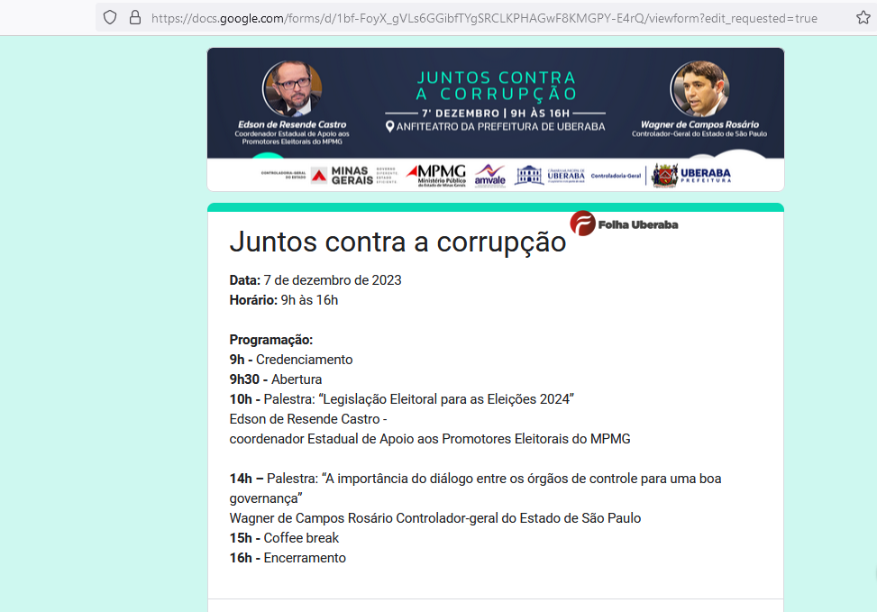 O início do evento está marcado para as 9h30, com mesa de abertura composta por representantes das instituições envolvidas no encontro, entre eles a controladora-geral adjunta do Estado de Minas Gerais, Luciana Cássia Nogueira. O credenciamento poderá ser feito até meia hora antes.