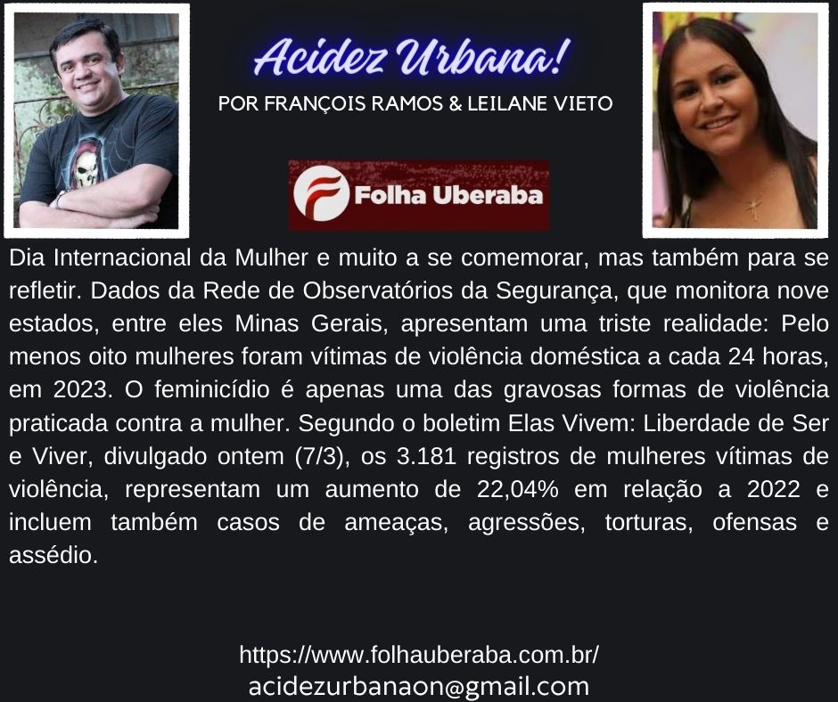 Hoje, 8 de março, é o Dia Internacional da Mulher. Elas têm muito o comemorar! Afinal, foram muitas conquistas nas últimas décadas, mas, infelizmente algumas estatísticas demonstram que, no Brasil, ainda há muito pelo que lutar. Dados da Rede de Observatórios da Segurança, que monitora nove estados, entre eles Minas Gerais, apresentam uma triste realidade: Pelo menos oito mulheres foram vítimas de violência doméstica a cada 24 horas.