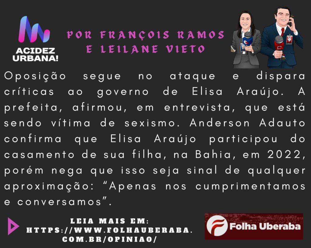 Enquanto isso, a prefeita Elisa Araújo também enfrentava dificuldades. O desgaste decorrente da determinação judicial, em sede liminar, na ação proposta pelo PDT, para a retirada da campanha publicitária “ela faz, ela cuida”, ao reconhecer presença de elementos que caracterizam conteúdo eleitoral implícito, fez com que ela se manifestasse a respeito, ontem, para afirmar que está sendo vítima de sexismo. Em entrevista ao Programa Pingo do J, da Rádio JM FM, a pré-candidata à reeleição disse que se o chefe do Executivo fosse um homem não haveria estardalhaço. Afinal, como escrever “O Prefeitura faz, o Prefeitura cuida?, indagou ela.