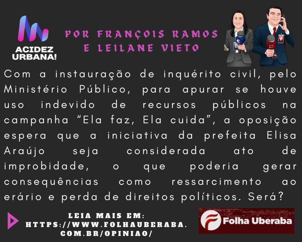 As denúncias feitas pelo PDT e pela Federação PSDB/Cidadania quanto ao uso de dinheiro público para propaganda eleitoral extemporânea continuam a provocar os desdobramentos. A possível caracterização de promoção pessoal da prefeita Elisa Araújo com a campanha “Ela faz, Ela cuida”, agora será objeto de investigação pelo Ministério Público de Minas Gerais (MPMG).