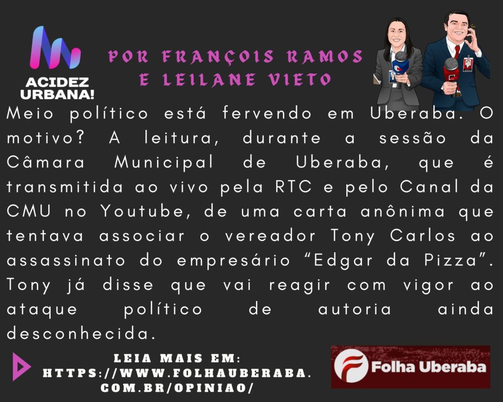 Meio político está fervendo em Uberaba. O motivo? A leitura, durante a sessão da Câmara Municipal de Uberaba, que é transmitida ao vivo pela RTC e pelo Canal da CMU no Youtube, de uma carta anônima que requeria o desarquivamento de um processo instaurado pela Comissão de Ética da casa legislativa, em 2002, contra então o vereador Tony Carlos.