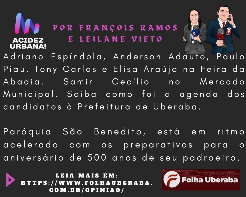 A agenda de Elisa Araújo (PSD), teve como ponto alto no final de semana, a passagem pela cidade do governador de Minas Gerais, Romeu Zema. Ele veio emprestar seu apoio à Prefeita de Uberaba e, na sexta-feira (30/08) participou com ela e seu companheiro de chapa, o radialista Maurício de Sá (MOBILIZA), de caminhada pela avenida Prudente de Morais. O ex-ministro de Agricultura do governo Jair Bolsonaro, Marcos Montes Cordeiro, estava entre as lideranças que acompanharam o grupo para pedir votos para a candidata à reeleição.