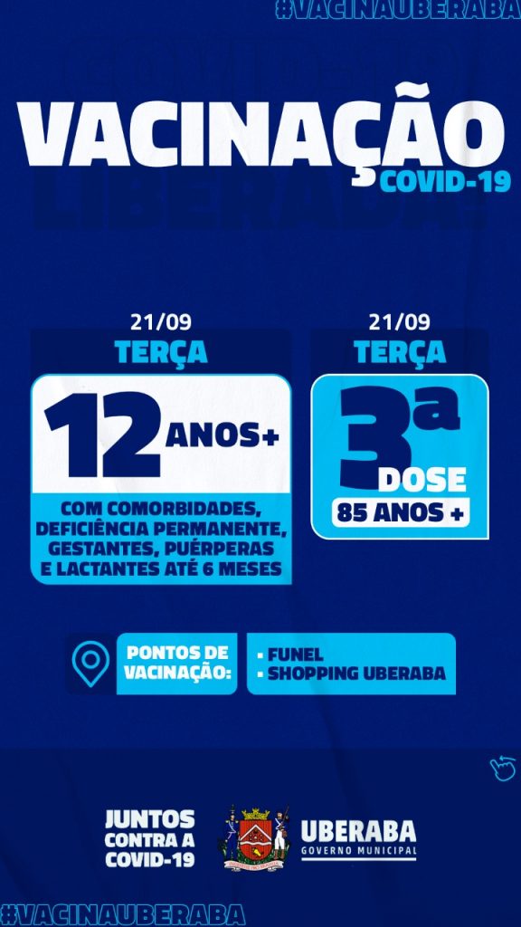 Segue ainda a vacinação do público acima de 12 anos com comorbidades, deficiência permanente, gestantes, puérperas e lactantes com crianças até 6 meses e com a vacinação da dose de reforço nos idosos a partir de 85 anos, nos drives da Funel e Shopping Uberaba.