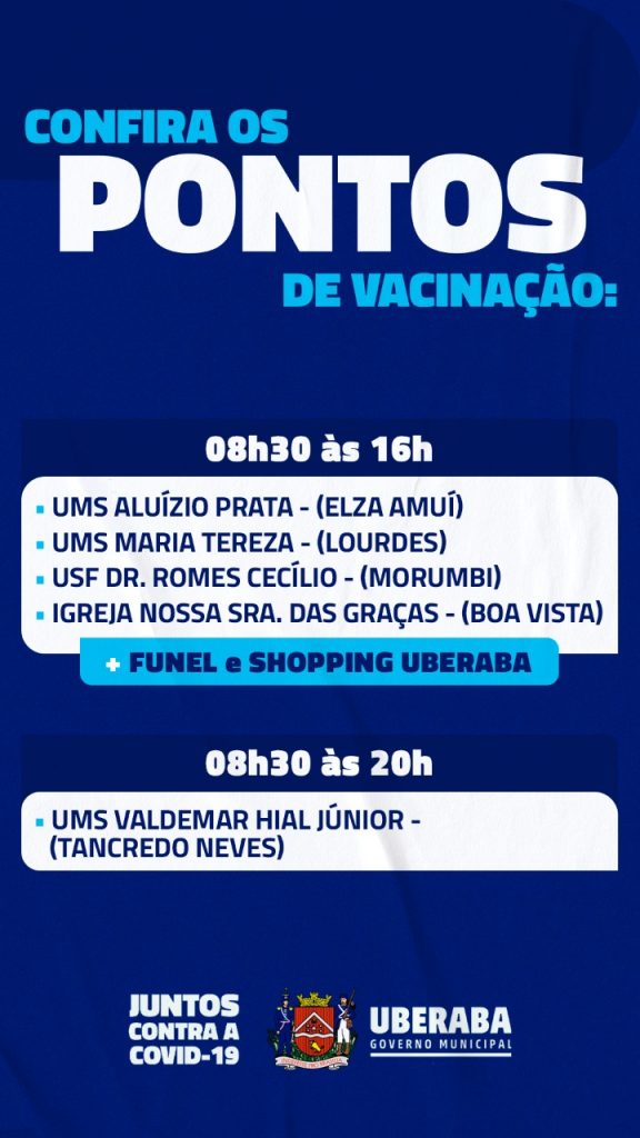 A vacinação segue das 8h30 às 16h na Funel, Shopping Uberaba e Unidades de Saúde, com exceção da Unidade Valdemar Hial que vacina até às 20h. Para tomar a 2ª dose é preciso apresentar um documento de identidade com foto, CPF, comprovante de residência de Uberaba no nome da pessoa a ser vacinada e o Cartão de Vacinas.