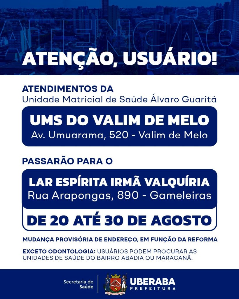 A Secretaria Municipal de Saúde (SMS) informa que os usuários da Unidade Matricial de Saúde (UMS) Álvaro Guaritá, do bairro Valim de Melo, estão sendo atendidos em outro local, devido à reforma da unidade. Até o final deste mês, os atendimentos serão realizados provisoriamente no Lar Espírita Irmã Valquíria, que fica localizado na via de cima, na Rua Arapongas, 890 – Gameleiras. Todos os serviços estão disponibilizados no local provisório, exceto odontologia. Neste caso, os usuários podem procurar a USF Virlânea Augusta de Lima, no bairro Jardim Maracanã, e a UMS Abadia para atendimento.