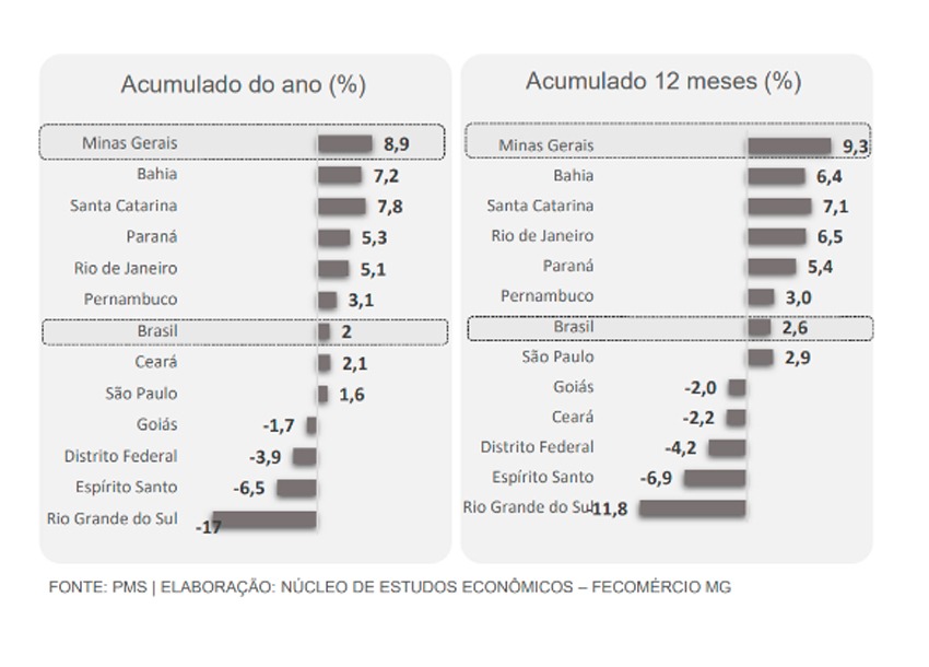 De acordo com Fernanda Gonçalves, economista da Fecomércio MG, apesar de Minas Gerais apresentar índice negativo de -0,1% na comparação mensal de setembro frente a agosto do ano corrente, nas outras vertentes analisadas Minas Gerais apresenta expansão acima da média nacional. O crescimento do turismo em Minas gerais, performou melhor do que o crescimento do turismo em outros estados.