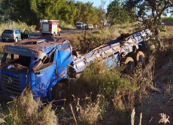 Motorista ficou gravemente ferido após colisão seguida de capotamento de caminhão em rodovia que passa por Uberaba. A vítima foi transportada para o hospital pela equipe da aeronave do Corpo de Bombeiros.