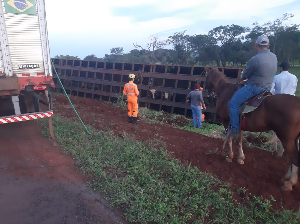 Uma carreta que transportava bovinos tombou em rodovia da região e o fato mobilizou equipes do Corpo de Bombeiros. As cabeças de gado ficaram presas na carroceria do veículo e duas morreram.