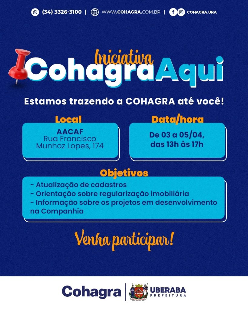 De acordo com o assessor especial de Projetos, Ricardo Carvalho, o objetivo do “Cohagra Aqui” é que a comunidade tenha acesso a diversos serviços prestados pela Companhia, como informações, esclarecimentos de dúvidas relacionadas às atividades, coleta de dados relevantes, atualização cadastral e regularização imobiliária.