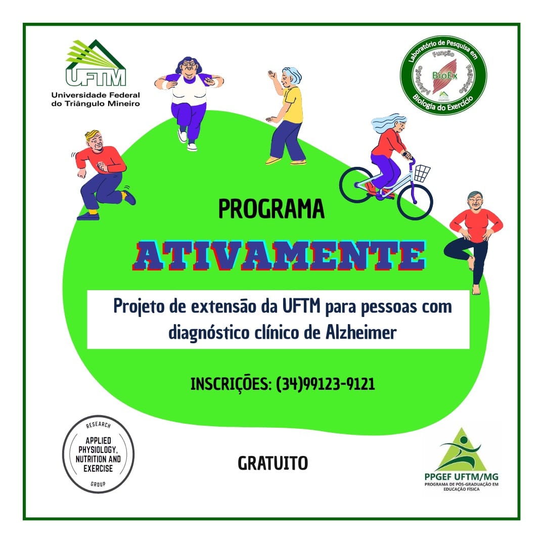 O Laboratório de Biologia do Exercício (BIOEX), do Programa de Pós-Graduação em Educação Física da Universidade Federal do Triângulo Mineiro (UFTM), está com inscrições abertas para o projeto de extensão Ativamente – Programa de Exercícios Físicos para Pessoas com Diagnóstico Clínico de Alzheimer. O projeto tem como objetivo oferecer a prática regular de exercícios físicos para pessoas que vivem com demência de Alzheimer, visando proporcionar maior qualidade de vida e contribuir para a estabilização do quadro clínico da doença.