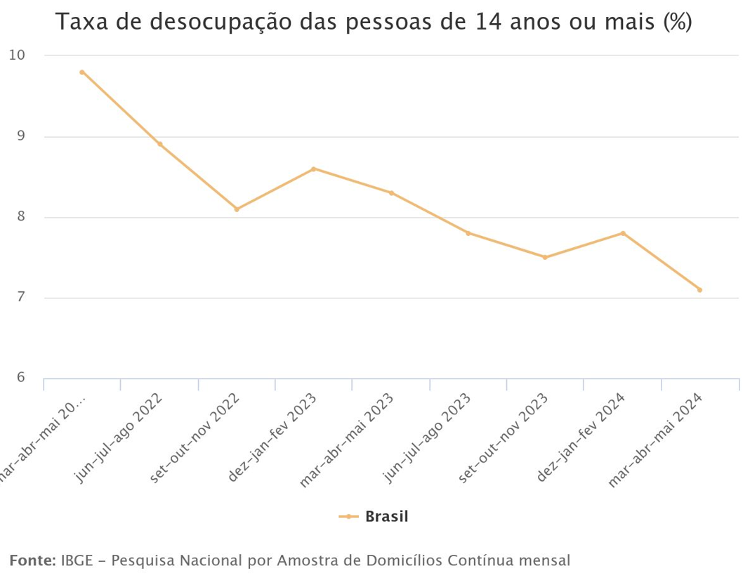 No trimestre móvel encerrado em maio de 2024, a taxa de desocupação recuou 0,7 ponto percentual (p.p.) frente ao trimestre de dezembro a fevereiro de 2024 (7,8%) chegando a 7,1%. Na comparação com o mesmo trimestre móvel de 2023 (8,3%), também houve recuo: -1,2 ponto percentual. Com isso, a taxa de desocupação foi a menor para um trimestre móvel encerrado em maio, desde 2014 (7,1%). São dados da Pesquisa Nacional por Amostra de Domicílios (PNAD) Contínua divulgada ontem pelo IBGE.