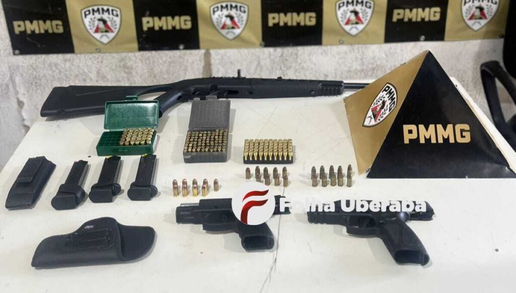 Policiais militares apreenderam armas de fogo e dezenas de munições durante abordagem em Uberaba. Dois homens envolvidos com crimes foram presos