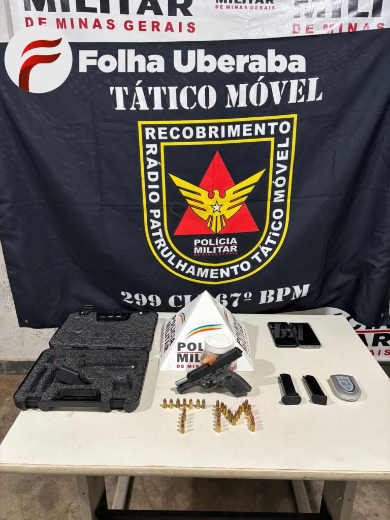 Policiais militares do Tático Móvel apreenderam uma arma de fogo durante negociação em Uberaba. Munições também foram encontradas com os envolvidos.