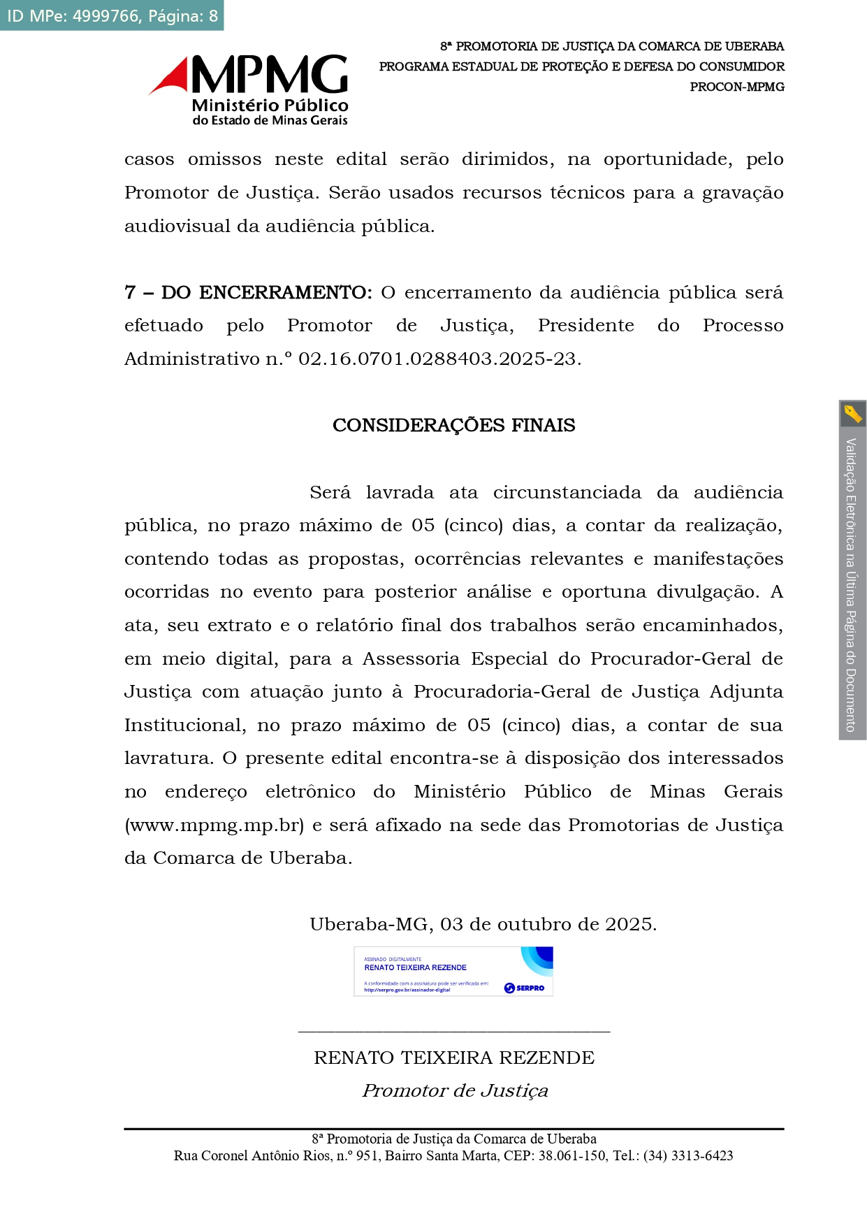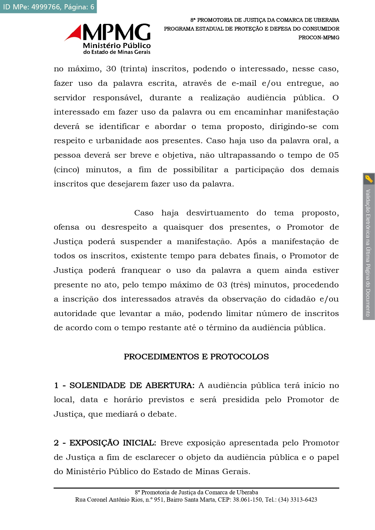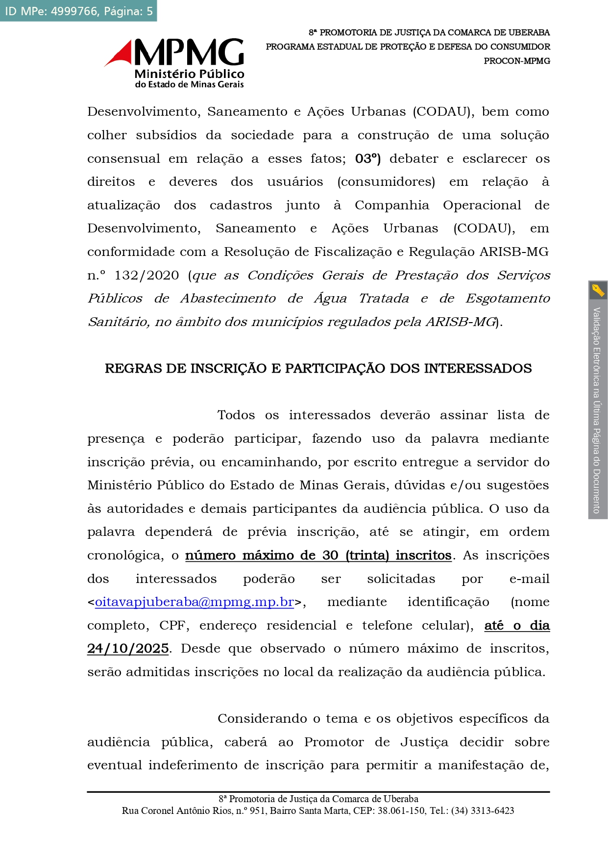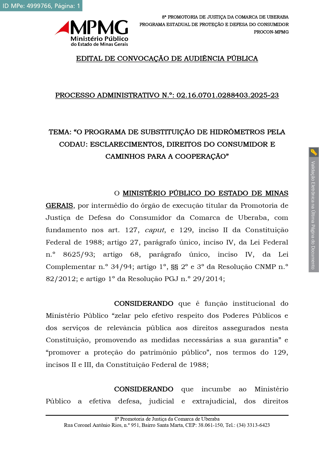 Edital de Convocação de Audiência Pública expedido no âmbito do Procedimento Administrativo n.o 02.16.0701.0288403.2025-23, instaurado para a análise, organização, estruturação, divulgação e realização de audiência pública na área de saneamento básico do Município de Uberaba. Mais especificamente, o objeto do expediente administrativo tem por referência o atual programa de substituição de hidrômetros implementado pela CODAU na cidade.