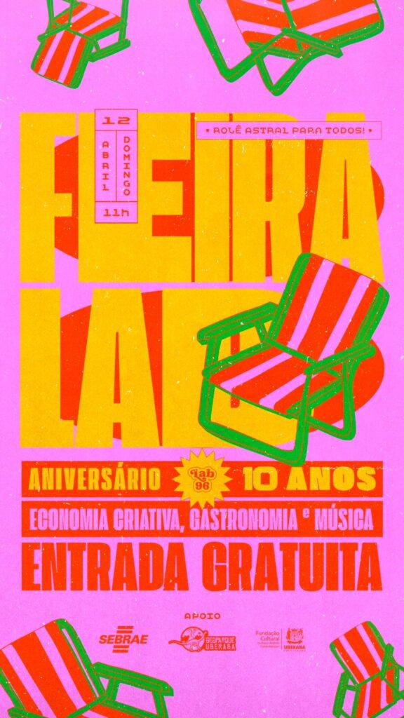 Domingo, 12, tem mais uma edição da Feira Lab, na Praça Comendador Quintino e entorno, das 11h às 19h. O evento é uma realização do Laboratório 96, e tem o apoio da Fundação Cultural de Uberaba “Professor Antônio Carlos Marques”, Sebrae e Geoparque Uberaba.