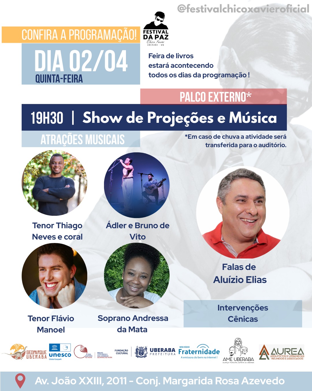 A abertura do festival, no dia 2 de abril, contará com um grande show em palco a céu aberto, a partir das 19h30, reunindo apresentações do tenor Thiago Neves e coral, do duo Ádler e Bruno de Vito, do tenor Flávio Manoel e da soprano Andressa da Mata. À noite, terá ainda a participação especial de Aluízio Elias e intervenções cênicas, promovendo uma imersão artística em homenagem ao legado do médium.