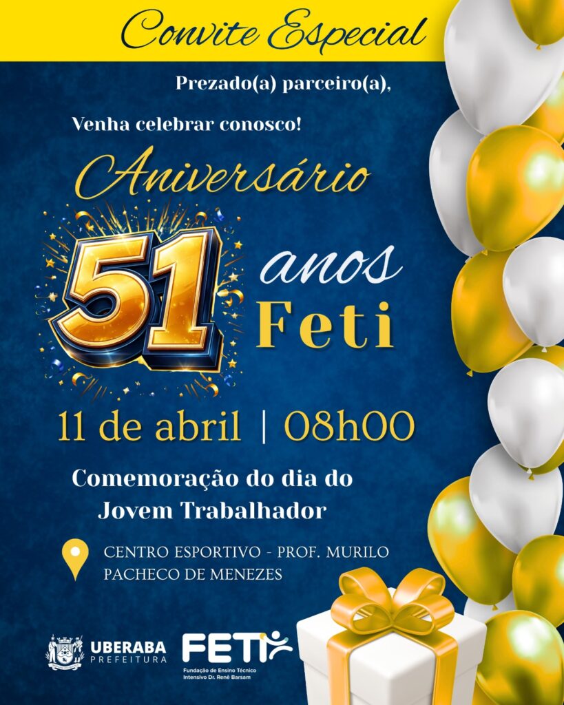 A Fundação de Ensino Técnico Intensivo “Dr. Renê Barsam” (Feti) celebra, no próximo sábado (11), seus 51 anos de história com uma programação especial no Centro Esportivo Prof. Murilo Pacheco de Menezes, localizado na Avenida dos Advogados, no bairro Sete Colinas. A data também marca as comemorações pelo Dia do Jovem Trabalhador, reforçando o compromisso da instituição com a formação profissional e a transformação de vidas por meio da educação.