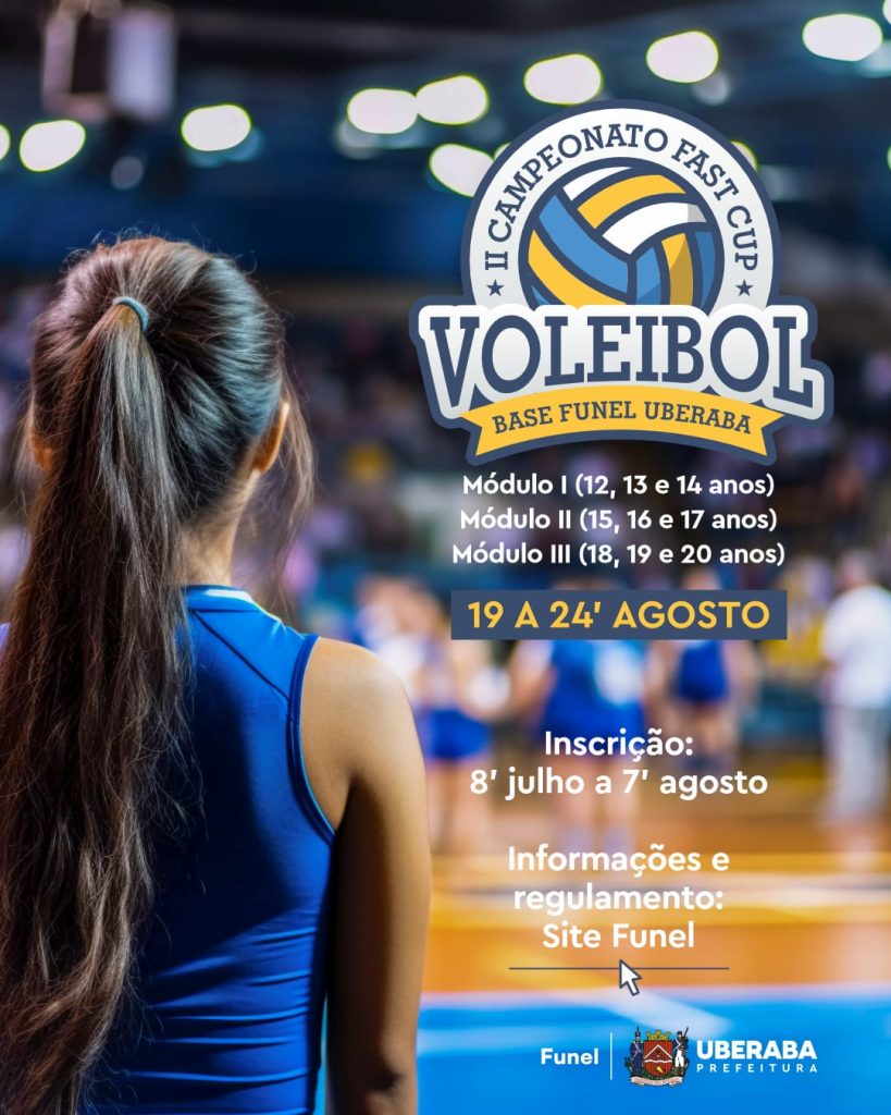 A Fundação Municipal de Esporte e Lazer (Funel) está com inscrições abertas até 7 de agosto para o II Campeonato Fast Cup de Voleibol Base Funel Uberaba, competição que acontece na Arena Funel, localizada no bairro Abadia, entre os dias 19 e 24 de agosto. O torneio será disputado em três categorias: Módulo I (12, 13 e 14 anos), Módulo II (15, 16 e 17 anos) e Módulo III (18, 19 e 20 anos), todas nos naipes Feminino e Masculino. A competição integra o Calendário Esportivo 2024, instituído pela Lei nº 11.417/2012.