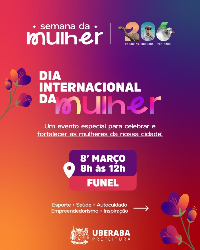 A Fundação Municipal de Esporte e Lazer (Funel) vai promover, neste domingo (8), das 8h às 12h, na Arena Funel, uma programação especial de atividades físicas em comemoração ao Dia Internacional da Mulher. A iniciativa integra a ação organizada pela Prefeitura de Uberaba, com atividades gratuitas voltadas ao público feminino e abertas à comunidade.