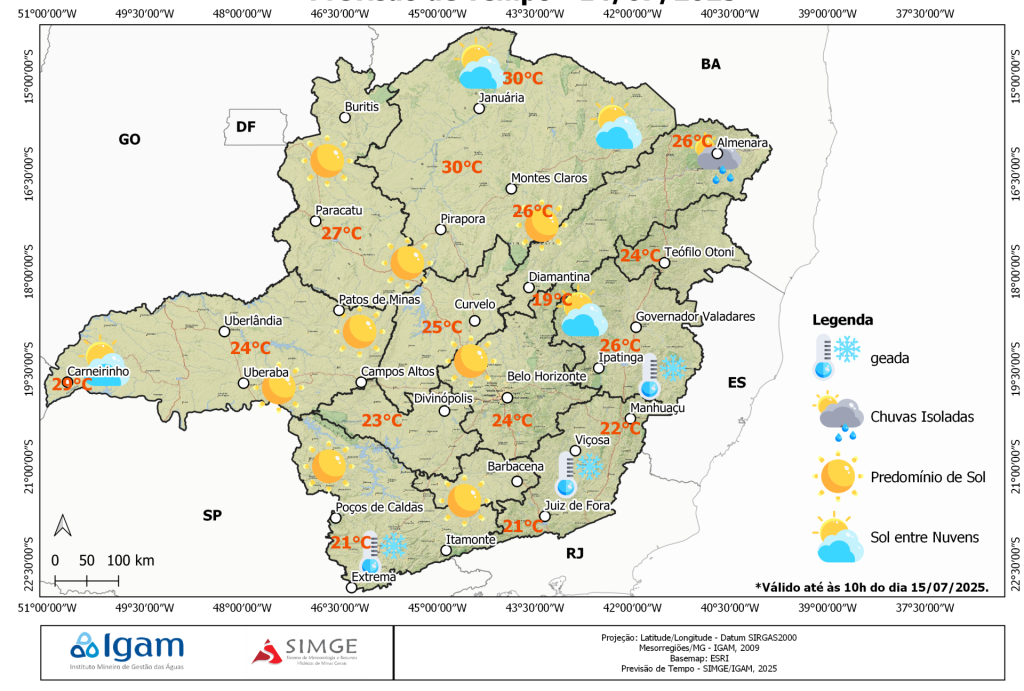 De acordo com o Sistema de Meteorologia e Recursos Hídricos de Minas Gerais (Simge) e o Centro de Inteligência em Defesa Civil, a umidade relativa do ar deve ficar entre 20% e 30% no Centro-Oeste do Triângulo Mineiro e nas áreas do Noroeste, Norte de Minas e Centro Mineiro.