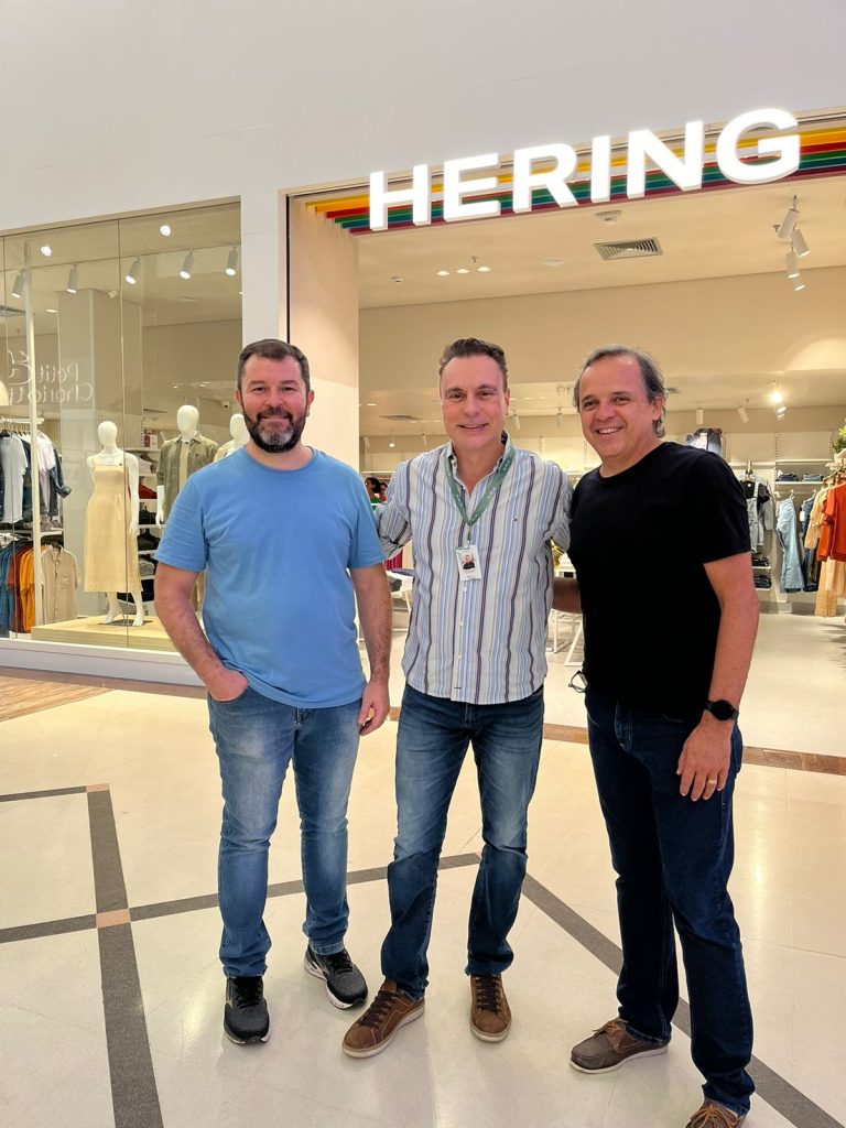 Foto: O superintendente Fabiano Guerra (centro) cumprimenta os lojistas da Hering, reinaugurada nesta semana, Leonardo Rossetti (esq) e José Eduardo Cezar de Oliveira