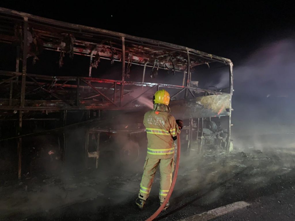 Um problema mecânico provocou incêndio que destruiu completamente um ônibus de passageiros em rodovia da região. Passageiros conseguiram resgatar algumas malas do bagageiro.