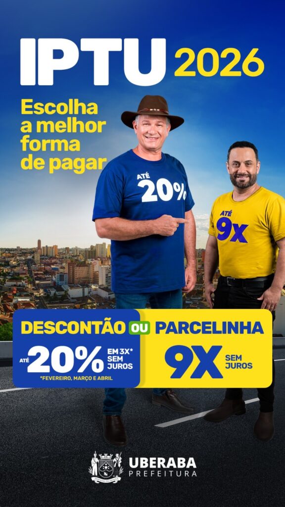A Prefeitura de Uberaba alerta os contribuintes que nesta segunda-feira, 9, vence a cota única ou a primeira de três parcelas para quem optar pelo pagamento do IPTU 2026 com desconto de até 20%, sendo 15% geral e mais 5% para imóveis participantes do programa IPTU Verde. Os vencimentos seguintes serão nos dias 9 de março e 9 de abril.