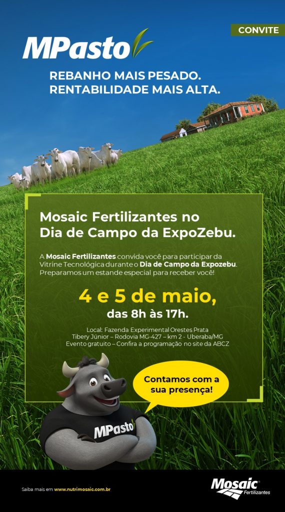 Empenhada em desenvolver soluções que contribuam com a sustentabilidade da produção agropecuária, a Mosaic Fertilizantes, uma das maiores produtoras de fosfatados e potássio combinados, estará presente no Dia de Campo da Expozebu em Uberaba (MG). Gratuito e aberto ao público, o evento será realizado nos dias 4 e 5 de maio, entre 8h e 17h, na Fazenda Experimental Orestes Prata Tibery Júnior.