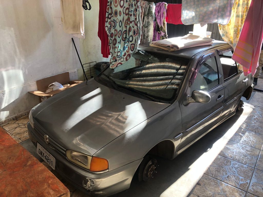 As equipes foram até a residência, abordaram uma moradora de 27 anos e durante vistorias encontraram o veículo Volkswagen Gol de cor chumbo com placas de Uberaba que estava faltando rodas, estepe, bateria e outras peças. Eles fizeram consultas no Centro de Operações da Polícia Militar (Copom) e foi constatado que o veículo tinha sido furtado há alguns dias na cidade. Os policiais questionaram a suspeita e ela relatou que um “amigo” tinha deixado o carro no local pedido para ela guardar.