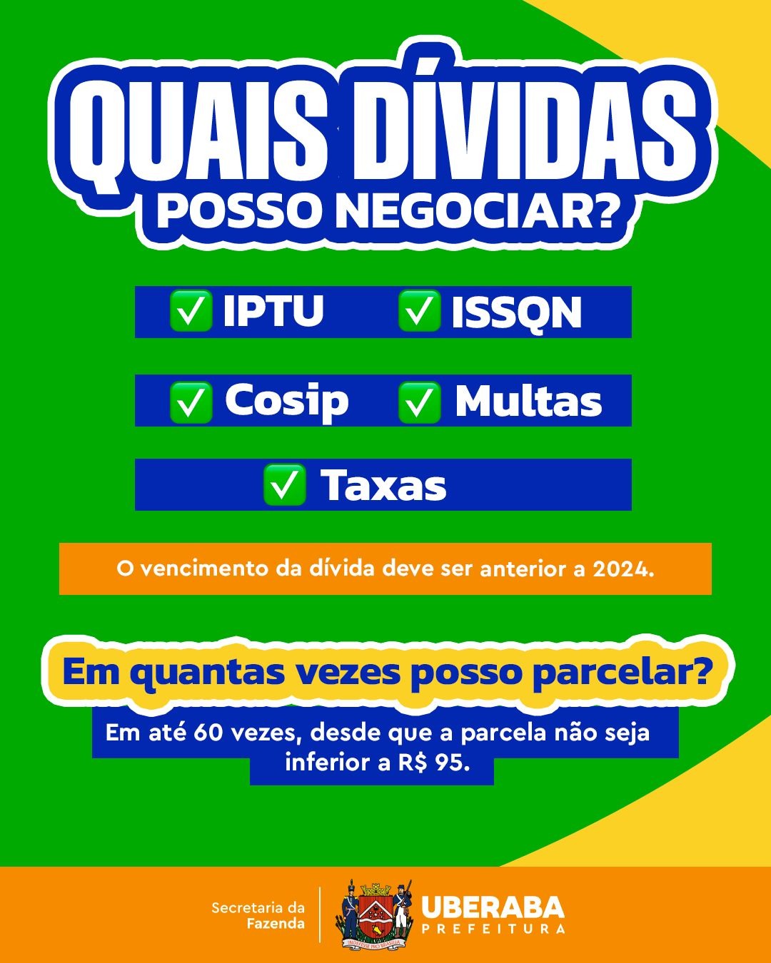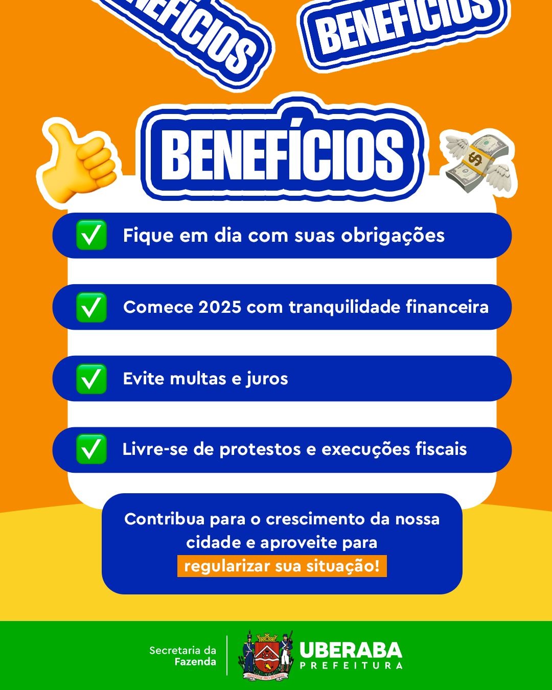 Além disso, a Sefaz orienta que os contribuintes que possuem dívidas com a Prefeitura de Uberaba regularizem sua situação com o município até o próximo dia 31 de dezembro para garantir que seus pagamentos sejam feitos com base na UFM de 2024. Vale lembrar também que a arrecadação dos tributos municipais é revertida em benefícios diretos para a população.
