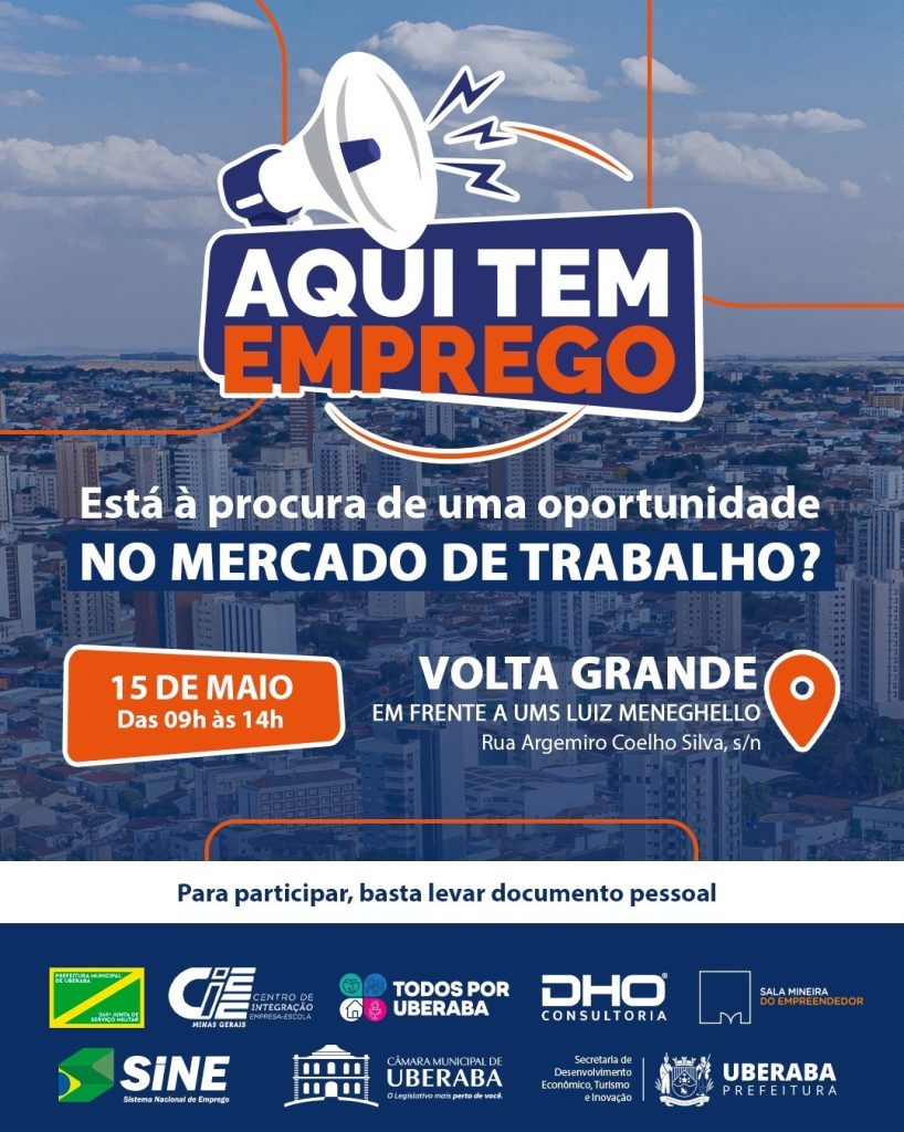A Prefeitura de Uberaba realiza nesta quinta-feira (15), das 9h às 14h, mais uma edição do programa Aqui Tem Emprego, agora no bairro Volta Grande, com a oferta de 363 vagas em diversos setores. A ação acontece em frente à Unidade Matricial de Saúde Luiz Meneghello e, além dos encaminhamentos para o mercado de trabalho, oferece uma série de serviços gratuitos à comunidade.