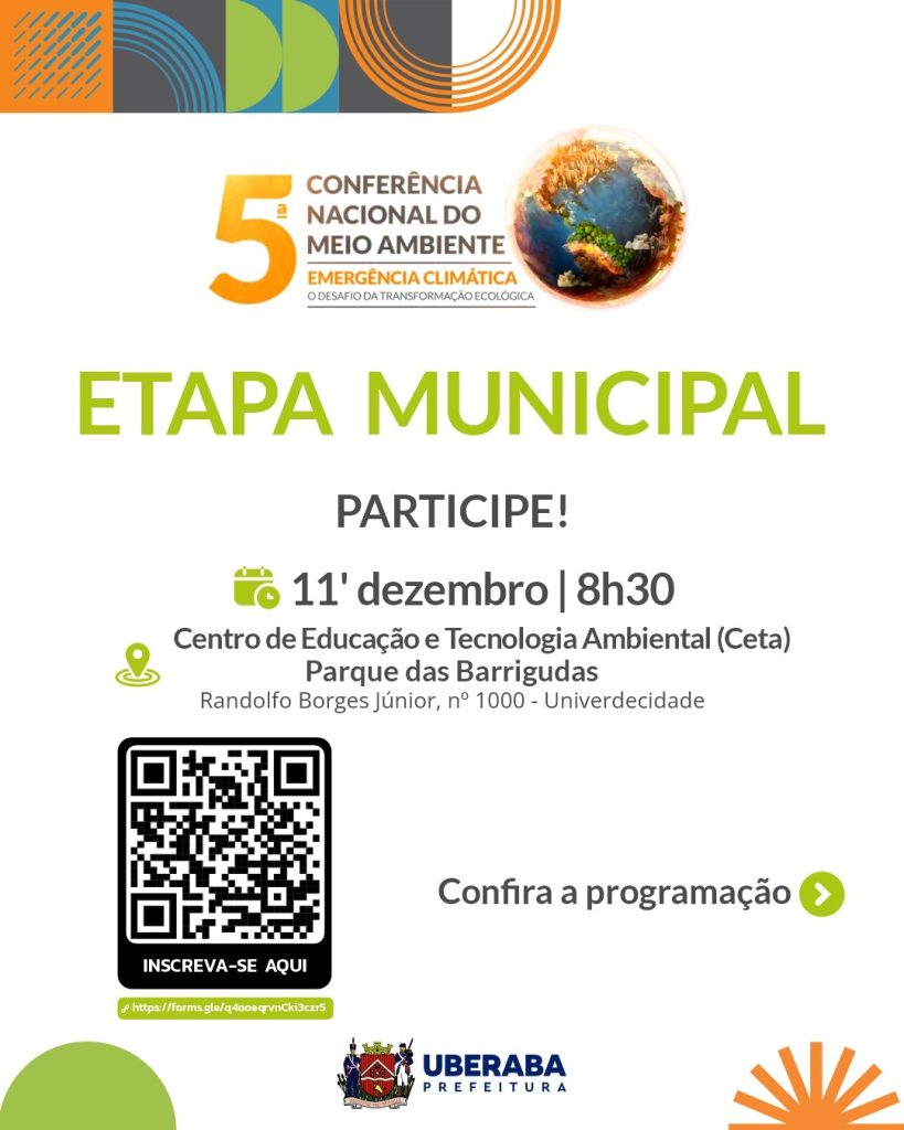 Estão abertas as inscrições para a 5ª Conferência Municipal do Meio Ambiente, promovida pela Prefeitura de Uberaba, por meio da Secretaria de Meio Ambiente (Semam). Os interessados podem se inscrever online pelo link https://forms.gle/q4ooeqrvnCki3czr5. O evento ocorrerá no próximo dia 11 de dezembro, às 8h30, no Centro de Educação e Tecnologia Ambiental (Ceta), localizado no Parque das Barrigudas – Avenida Randolfo Borges Júnior, nº 1000, Univerdecidade.
