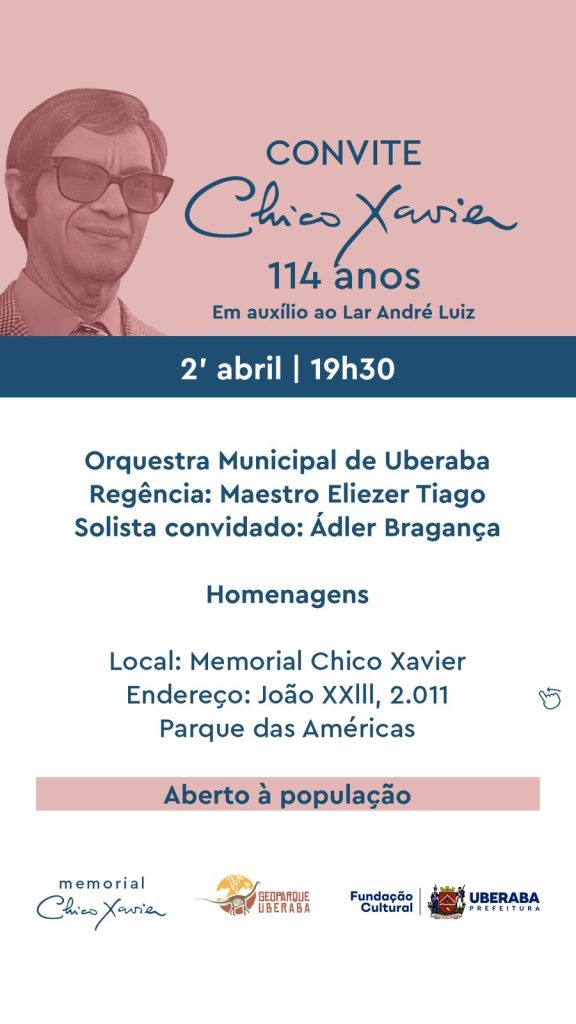 A Prefeitura, por meio da Fundação Cultural de Uberaba “Professor Antônio Carlos Marques” (FCU), comemora nesta terça-feira, dia 2, às 19h30, o 114º aniversário do nascimento de Chico Xavier. O evento, aberto à população, será no Memorial Chico Xavier (MCX), localizado na avenida João XXIII, 2.011, bairro Parque das Américas.