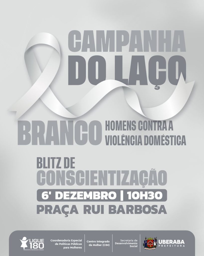 A blitz encerra a campanha do Laço Branco em Uberaba, organizado pelo Centro Integrado da Mulher (CIM) e pela Coordenadoria Especial de Políticas Públicas para Mulheres. Durante a atividade, as equipes distribuirão panfletos educativos com alerta sobre os tipos de violência doméstica e os canais de denúncia.
