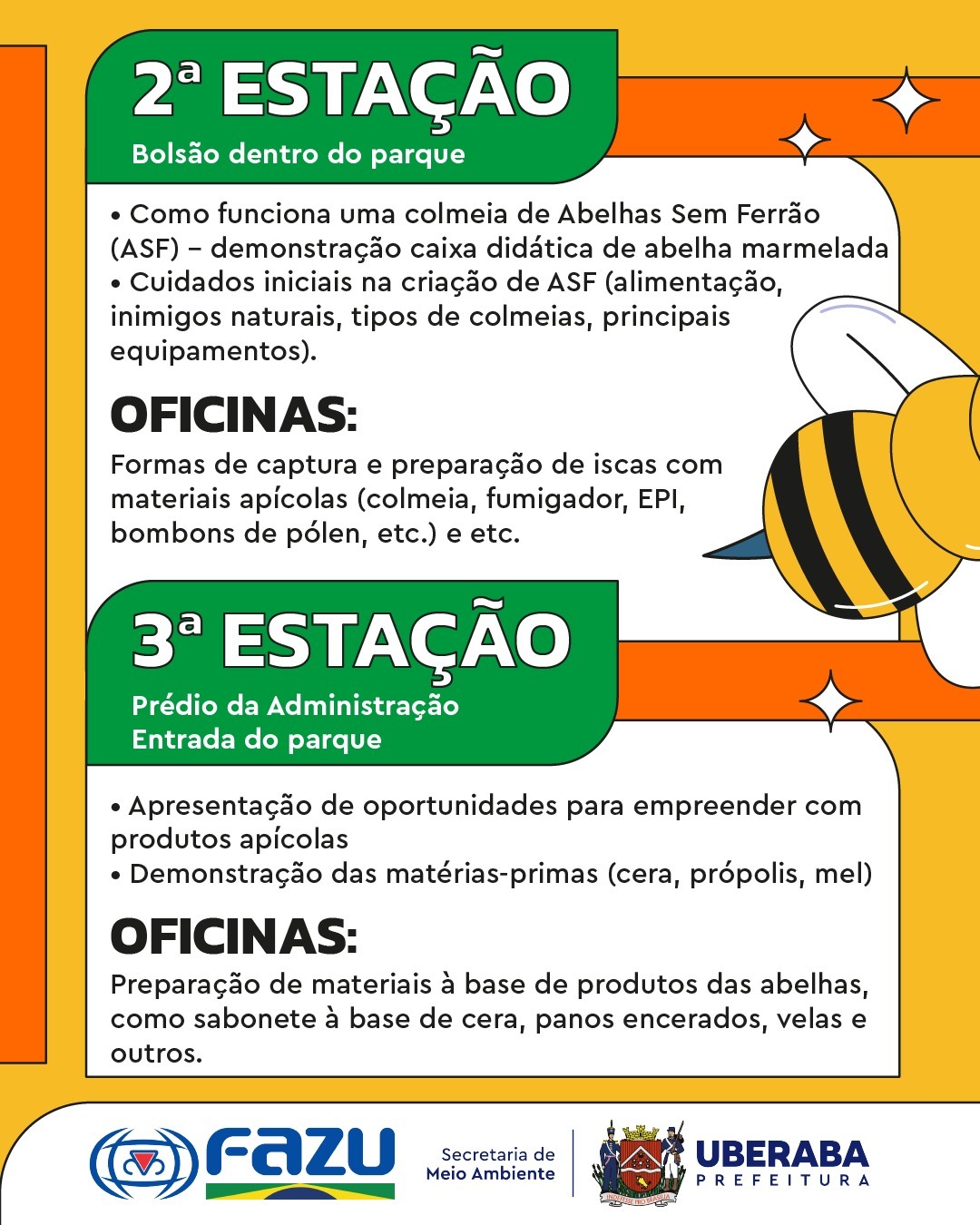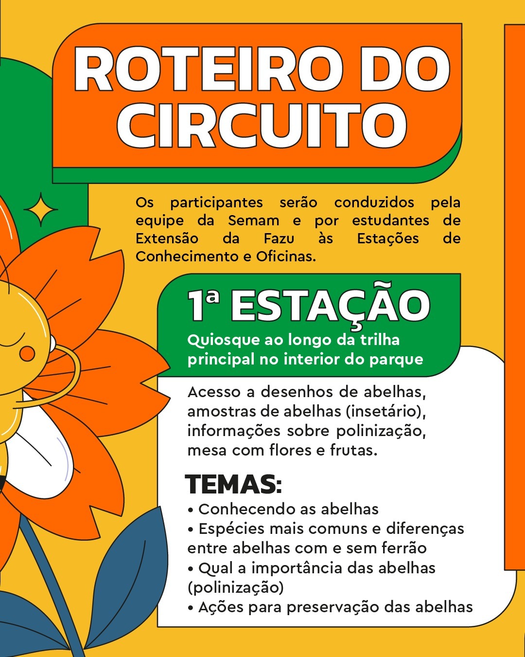 Já na entrada haverá uma tenda com informações sobre o encontro e direcionamento no roteiro. O primeiro ponto será no quiosque ao longo da trilha do parque, onde os participantes vão conhecer as abelhas, espécies mais comuns e diferenças entre aquelas com e sem ferrão. E também a importância delas na polinização das plantas e ações preservacionistas.