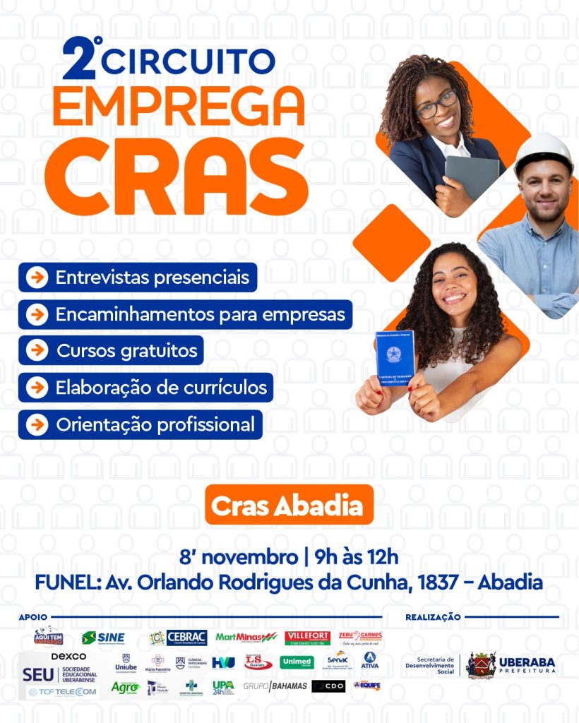 O 2º Circuito Emprega Cras, promovido pela Prefeitura de Uberaba, por meio da Secretaria de Desenvolvimento Social (Seds), segue em Uberaba. Nesta sexta-feira (8), a equipe estará posicionada na Funel, das 9h às 12h. A Fundação Municipal de Esportes fica localizada na Av. Orlando Rodrigues da Cunha, 1.837 – Abadia.