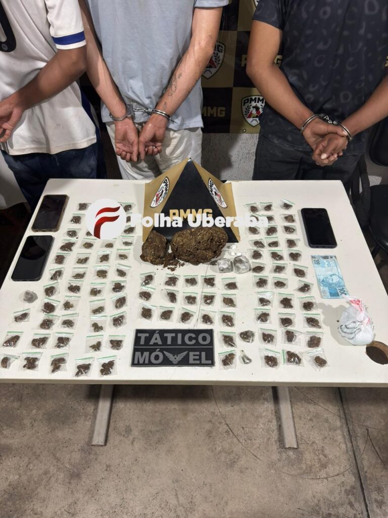 Ao ser questionado, ele relatou que estava vendendo os entorpecentes e mostrou aos policiais o local em que fazia a retirada dos produtos ilícitos. As equipes foram até o imóvel indicado e viram mais dois suspeitos que, ao perceberem a presença policial, fugiram correndo para os fundos, mas foram perseguidos, abordados e capturados. Durante buscas, os militares encontraram uma sacola que continha cerca de 100 porções de maconha, além de porções de cocaína, materiais para cortar e embalar as drogas e dinheiro. Outro suspeito de tráfico de drogas que chegou ao local também foi abordado e preso. Os quatro envolvidos com tráfico de entorpecentes foram levados até a delegacia de Polícia Civil para esclarecimentos com a autoridade policial de plantão.