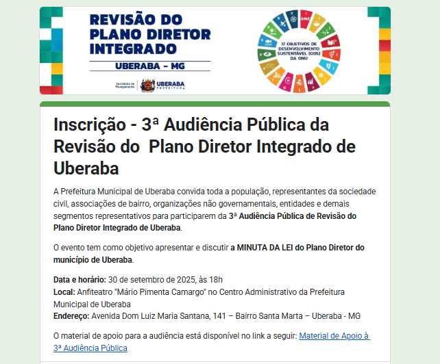 A 1ª audiência foi em novembro de 2024, quando foram apresentados os diagnósticos da legislação já existente e os 17 Objetivos de Desenvolvimento Sustentável (ODS), no contexto da Agenda 2030 da Organização das Nações Unidas (ONU), que serve como pilar estruturante para a revisão do Plano Diretor Integrado. Já a 2ª audiência aconteceu em março de 2025, com a apresentação das proposições para a Revisão da Lei do Plano Diretor Integrado de Uberaba.