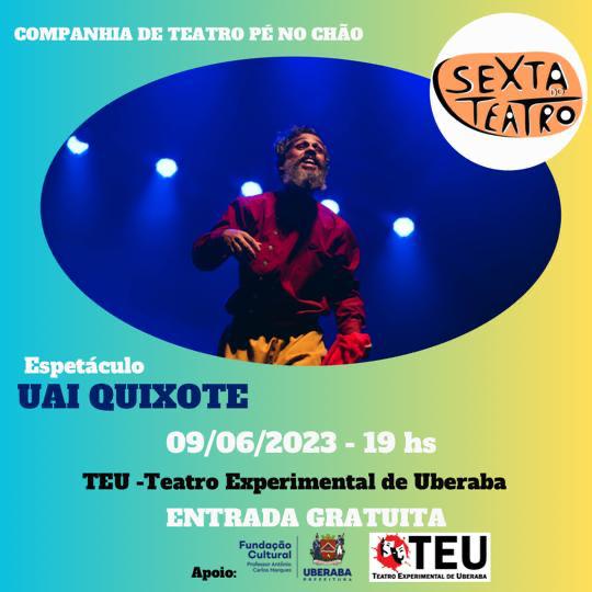 Dessa vez, o espetáculo é “Uai Quixote”, às 19h, no Teatro Experimental de Uberaba, que receberá 148 pessoas, por ordem de chegada. Uma peça apresentada pela Companhia de Teatro Pé no Chão, livremente inspirada no livro Dom Quixote, escrito pelo espanhol Miguel de Cervantes.
