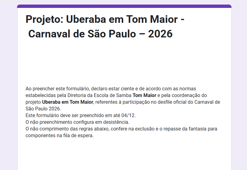 Apenas moradores de Uberaba ou pessoas nascidas na cidade podem participar do processo. O não preenchimento dentro do prazo será considerado desistência. A participação requer o cumprimento das orientações da Diretoria da Tom Maior e da coordenação do projeto “Uberaba em Tom Maior”, incluindo presença em ensaios de rua, quadra, técnicos e imersões em Uberaba, além de domínio do samba-enredo, uso da camiseta oficial da ala e participação no desfile em Uberaba e no Desfile das Campeãs. Quem não cumprir as normas poderá ter a fantasia repassada para integrantes da lista de espera.