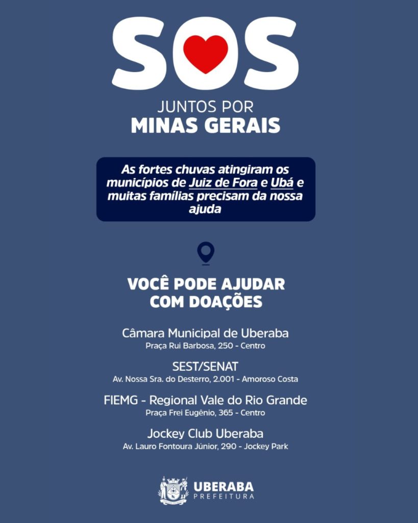 A Prefeitura de Uberaba, por meio da Defesa Civil, está mobilizando a campanha “SOS Juntos por Minas” para arrecadar donativos destinados às famílias atingidas pelas fortes chuvas nos municípios de Juiz de Fora e Ubá. A ação conta com pontos de coleta espalhados pela cidade e tem como objetivo reforçar a rede de solidariedade e garantir apoio às vítimas neste momento de dificuldade.