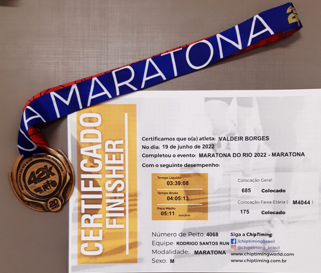 Depois de cinco meses de preparação e sempre encorajado pelo lema “Pensamento positivo, atitude, foco e determinação”, conseguiu completar a prova em 3h39min08s. Independente desse resultado, Valdeir destaca que, desde setembro de 2018, a corrida de rua tornou-se uma paixão, um estilo de vida, uma terapia em movimento, o que tem corroborado para a saúde física e mental. Portanto, correr é vida!